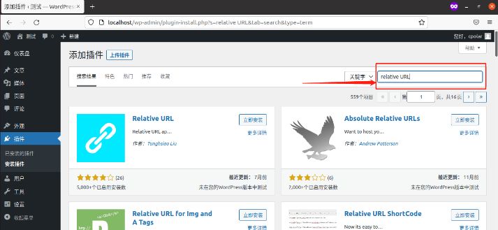 想要让本地的WordPress网站发布到公共互联网,我们需要先安装一个相对url插件(这里我们使用relative url),我们只要在WordPress仪表盘的“插件”页面,就能搜索、安装并启用。
