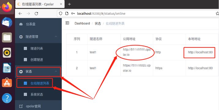 此时我们点击cpolar客户端主界面“状态”项下的“在线隧道列表”,就能获得这条数据隧道的入口,即Ubuntu本地网页的公网访问地址。互联网访客能通过这个地址,访问到本地网页。