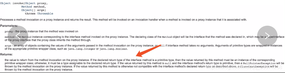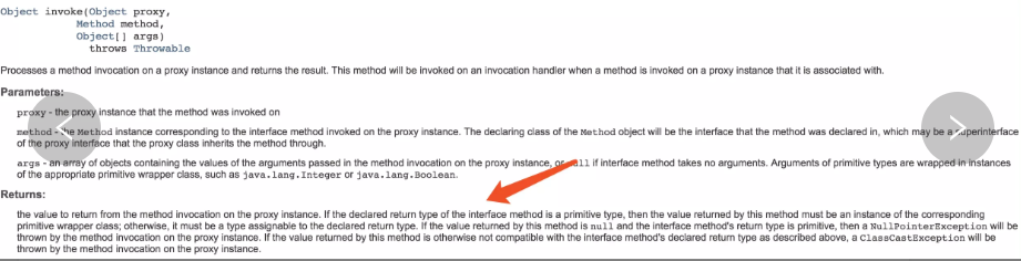 仔细观察官方版本的InvocationHandler,它和我们自己的实现的版本也有一个细微的差别:官方版本invoke方法有返回值,而我们的版本中是没有返回值的。那么,返回值到底有什么作用呢?直接来看官方文档: