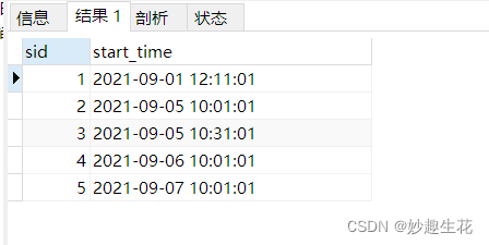 效果图(不要看上面的sql语句是怎么写的 这里不做解释 重点是看下面的效果图 我是将start_time字段升序排序 然后加了一个排名的sid字段和值)