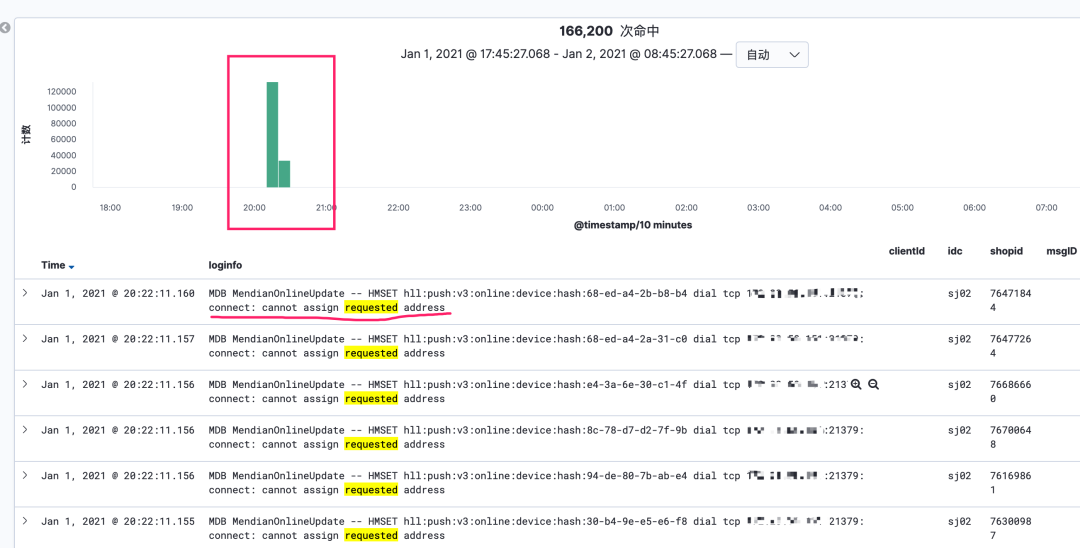 下面是 kibana 日志的统计,出错的时间区间里有近 16w 次的 redis 报错。