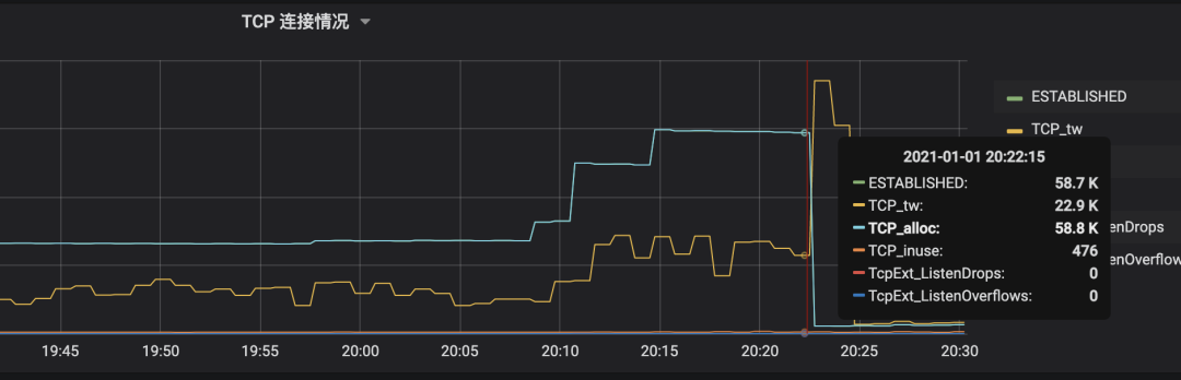 下面是出问题节点的 TCP 连接状况,可以看到 established 在 6w,而time-wait 连接干到 2w 多个。