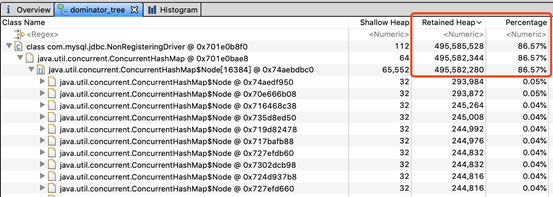 然后紧急把剩余未gc的一个节点内存dump下来,使用mat工具打开发现,com.mysql.jdbc.NonRegisteringDriver 对象占了堆内存的大部分空间。