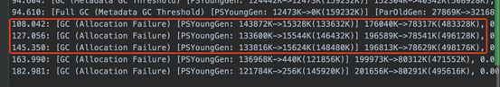 期间观察gc日志,gc时间间隔约20s,100s后发生5次 gc