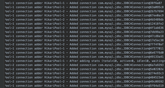 观察 hikari日志,确认有20个连接对象生成,以及产生总连接10个,空闲连接10个。