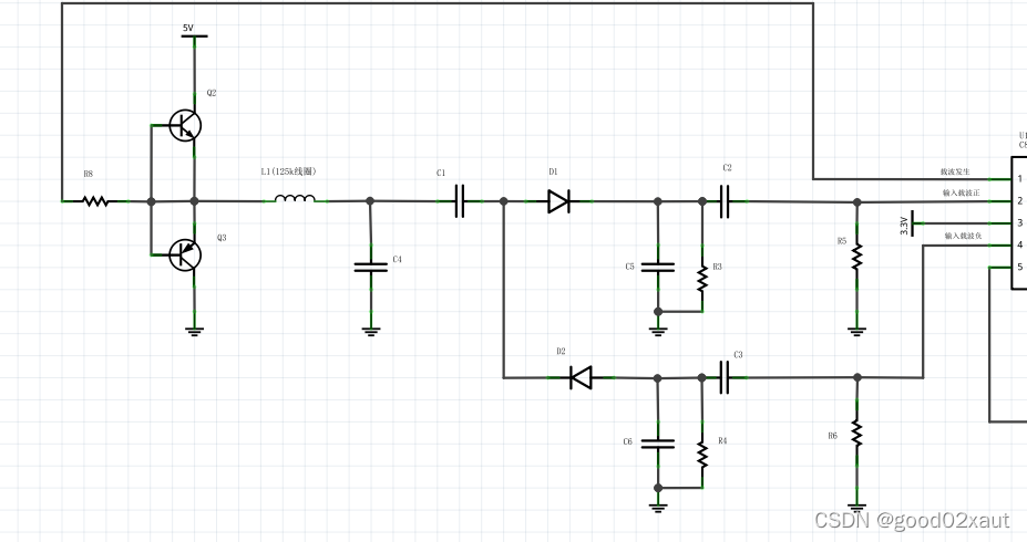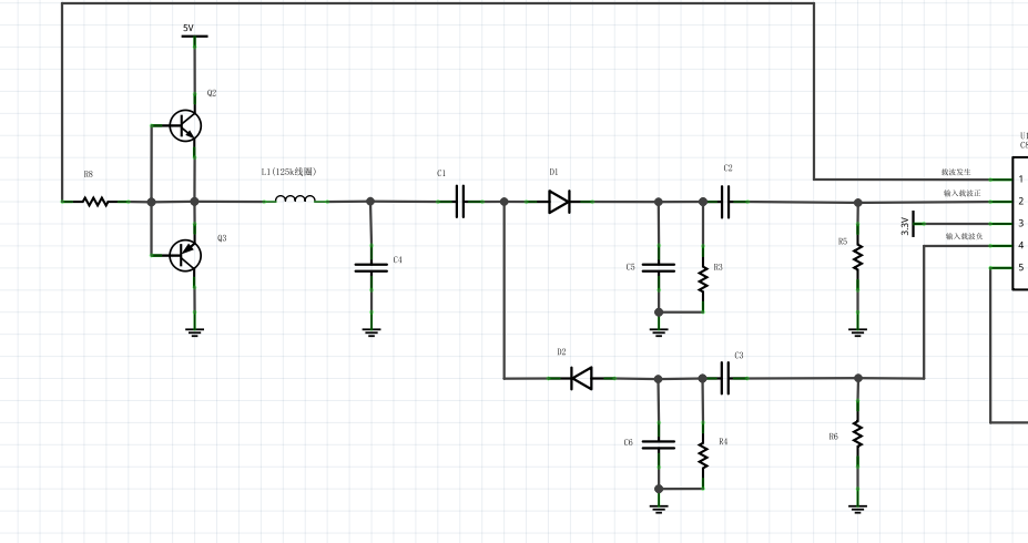 分立元件完成两个功能:125K方波信号放大,正弦波的发射和检波。