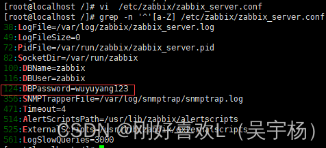 grep -n '^'[a-Z] /etc/zabbix/zabbix_server.conf #确认数据库用户及密码