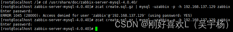 导入数据到数据库zabbix中(最后一个zabbix是数据库zabbix),且因为用户zabbix是%(任意主机),所以登录时需要加上当前主机ip(-h 192.168.137.129),密码是用户zabbix登陆密码wuyuyang123