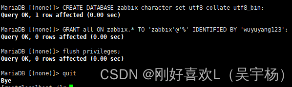 GRANT all ON zabbix.* TO 'zabbix'@'%' IDENTIFIED BY 'ykadmin123'; #授予zabbix用户zabbix数据库的所有权限,密码wuyuyang123(这是刚刚初始化的密码)