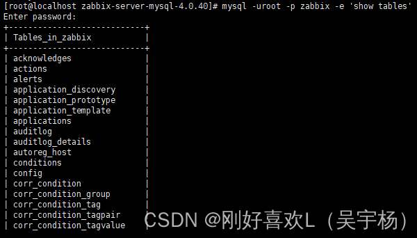 mysql -uroot –p zabbix –e ‘show tables’