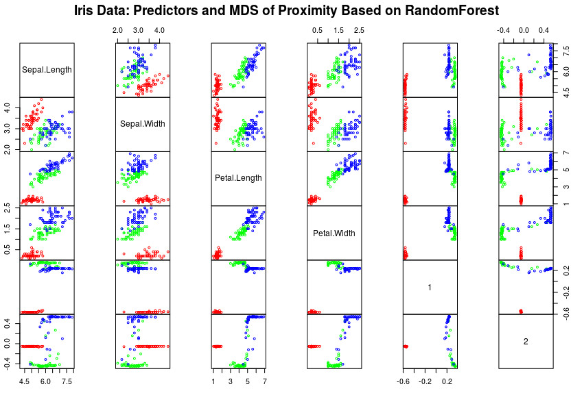 main="Iris Data: Predictors and MDS of Proximity Based on RandomForest")