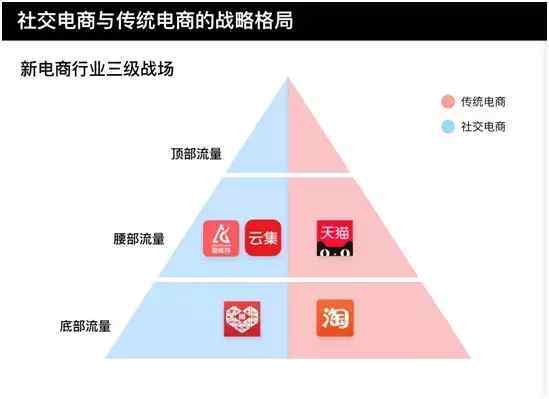 再透过“社交电商”体系布局,可以窥探出基本匹配自己底部、腰部、顶部流量,从各个方面对抗传统电商。