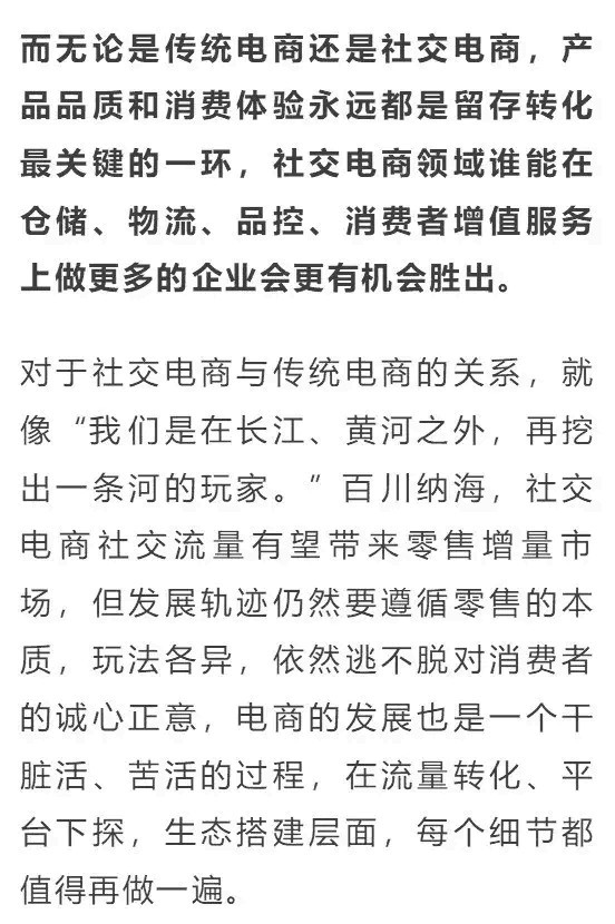 资本方看中的就是社交电商能够实现多样化的营销渠道,让产品能更加迅速为消费者所熟知,同时也为消费者提供更快捷、更便利的消费方式。
