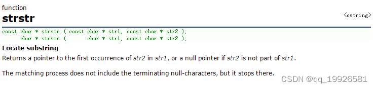 查找str1中的字符串是否包含str2子字符串,若包含,则返回子字符串的首地址;若不包含,则返回NULL。