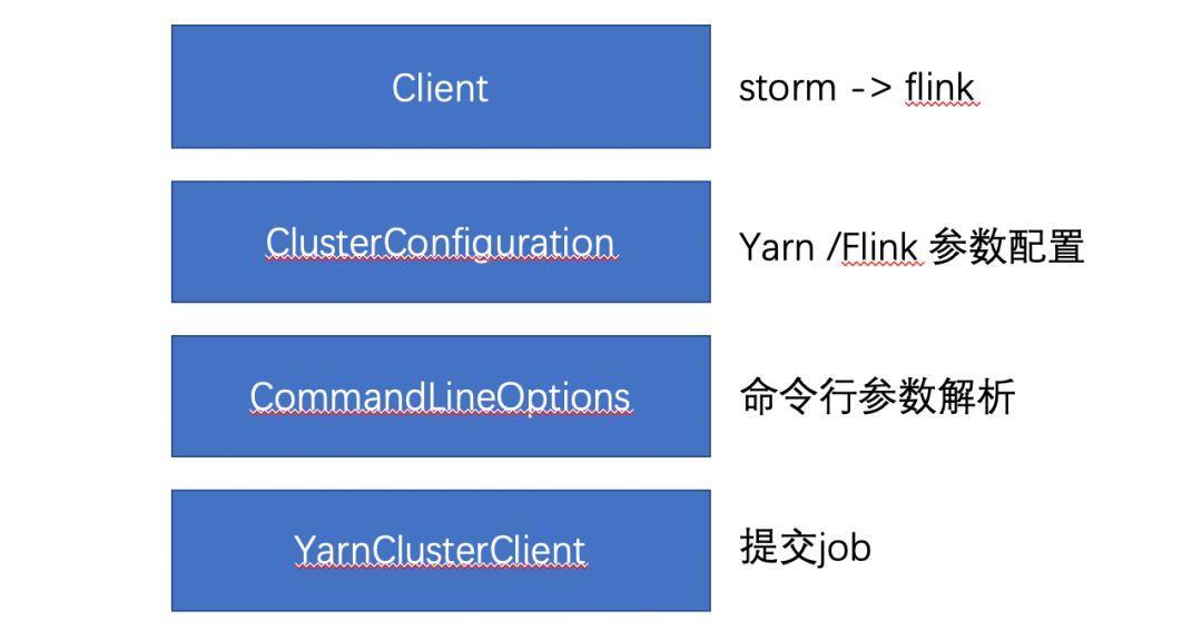 Flink-Storm 默认支持 local 和 standalong 模式任务提交,无法将任务提交到 yarn 集群,我们在建设 Flink 集群一开始就选择了 yarn 模式,便于集群资源管理和统一实时计算平台,因此需要自行实现支持 yarn 的 runtime 功能,这里主要涉及 yarn client 端设计。
