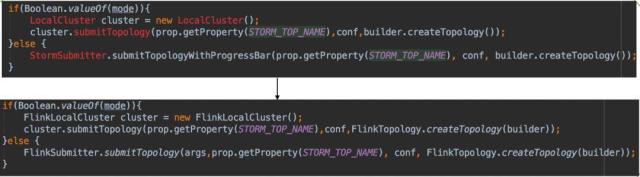 FlinkTopology.createTopology(builder) 将 StormTopology 转换为 Flink 对应的 Streaming Dataflow。