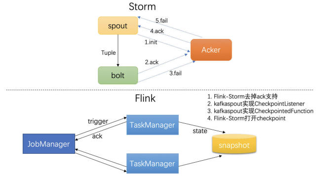 Storm 使用 ACK 机制来实现传递语义保证,我们没有将 Storm 的 ACK 机制移植到Flink-Storm。因此,某些依赖 ACK 机制的功能会受到限制。比如,Kafka spout 将消费状态存储在 ZK,状态的更新需要依赖 ACK 机制,tuple 树结束后,spout 才会触发状态更新,表示这条消息已经被完全处理,从而实现 at least once 的传递保证。Storm 也提供了at most once 的支持,spout 发送消息后,无需等待 tuple 树结束直接触发状态更新。我们使用了 Storm 的实现 at most once 的方式,在 Kafka spout 实现 at most once 的基础上,通过实现 Flink Checkpoint 的状态机制,实现了 Flink-storm 任务的 at least once。Storm 任务迁移到 Flink,传递保证不变。