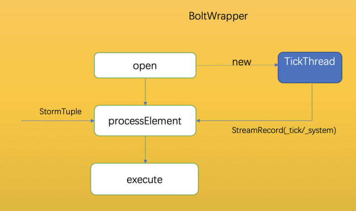Storm 使用 tick tuple 机制实现定时功能,消息超时重发、Bolt 定时触发等功能都要依赖 tick tuple 机制。Storm 0.9.5 版本没有实现窗口功能,用户可以使用 tick tuple 机制简单实现窗口功能。我们同样为 Flink-Storm 增加了 tick tuple 机制的支持,使用方式也和 Storm 中使用方式一样,配置 topology.tick.tuple. freq.secs 参数,即开启了 tick tuple 功能。