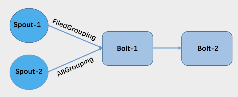 AllGrouping 分组方式对应于 Flink 是 Broadcast。如图,bolt-1 有两个输入,这种情况下,原 flink-storm 的实现,spout-2 到 bolt-1 的数据分区的表现形式和Rebalance(Flink 术语)一样,而不是 Broadcast。我们优化了这种场景,使其卖二手游戏账号数据分组表现和 Storm 中是一样的。