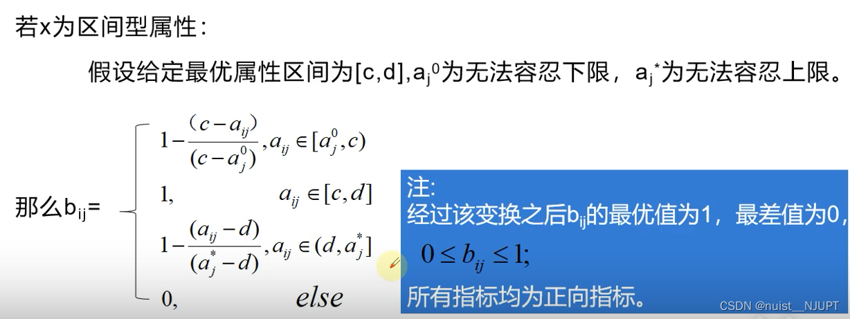 对于区间型的指标,对区间型数据进行规范化处理,使用分段函数,其中[c,d]区间是最优区间,落在其中是最优的,赋值为1,超出最大和最小容忍范围则赋值为0.