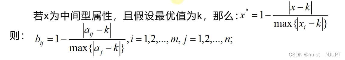 假设生产零件的合格长度是12cm,则属于中间型,距离中间属性越近,变换后则越接近1,说明越好,属性越优。