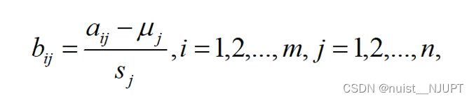 数理统计的方法,每一列的数减取该列的平均值,然后除以该列的标准差。经过标准化样本法变换后标准化样本矩阵的均值为1,方差为0。MATLAB中zscore()方法实现,用SPSS等工具也能计算。
