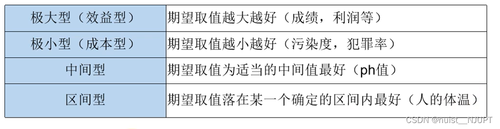 对于多属性决策变量,一般需要数据预处理,一般会给出指标,常见的指标类型如下: