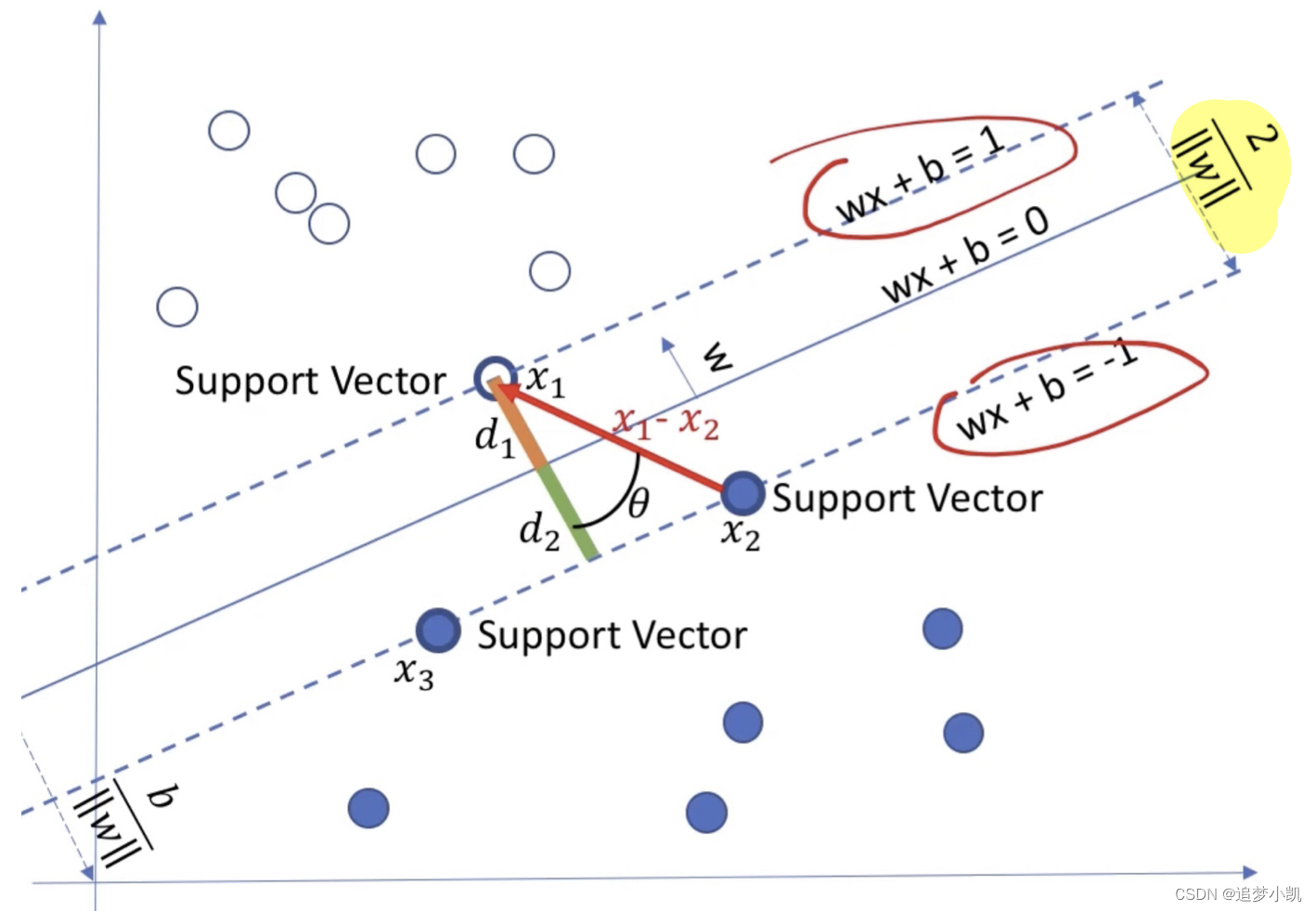 而x_1-x_2的模即为两个超平面之间的距离,则我们的目标函数可以转化为求\parallel w\parallel的最小值
