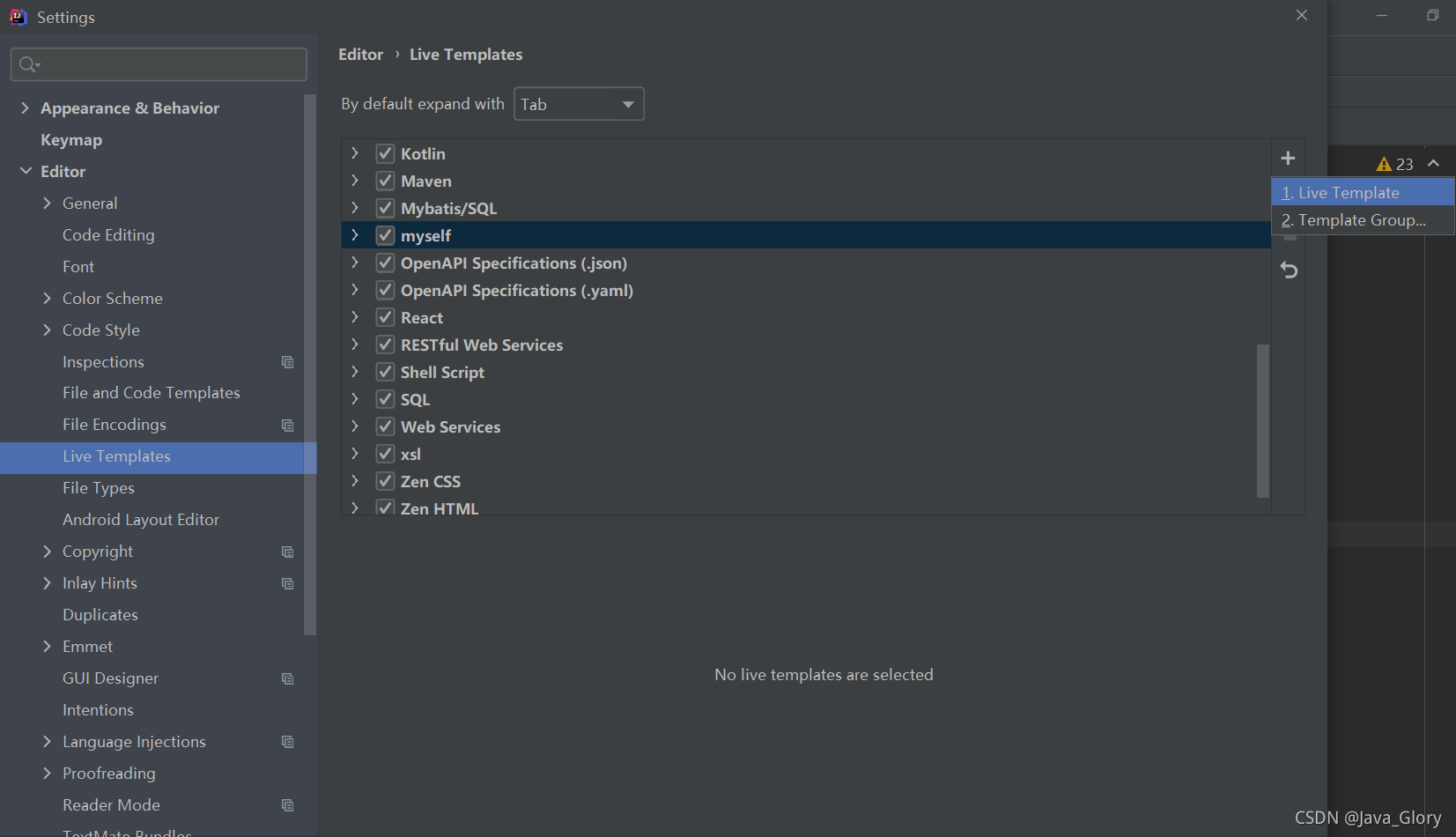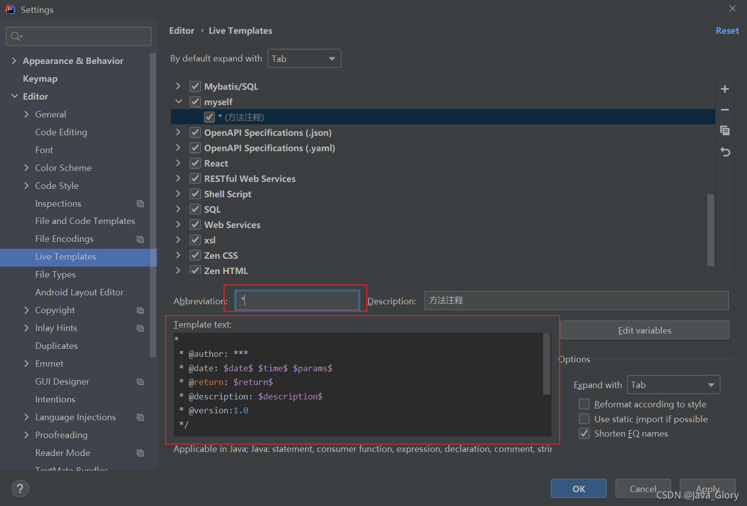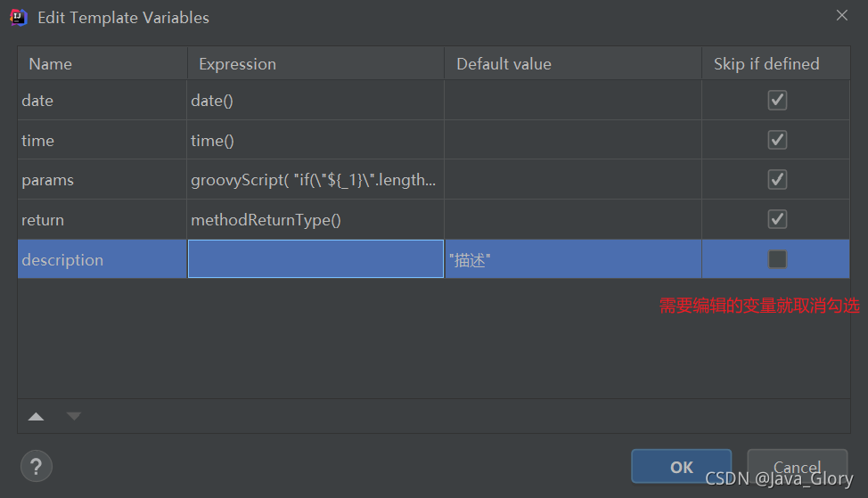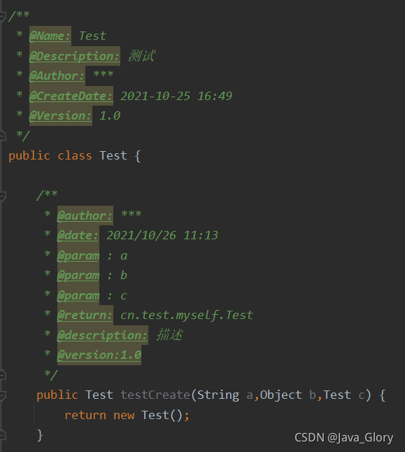 groovyScript("def params=\"${_1}\";def index=params.lastIndexOf('.', params.indexOf('<'));if(index!=-1){params=params.substring(index+1);};index=params.indexOf('.');if(index!=-1&¶ms.indexOf('<')==-1){params=params.substring(index+1);};return params.replaceAll('java.lang.', '').replaceAll(',',', ');", methodReturnType()) 注意:默认是按Tab键生成的。 方法注释需要编辑的变量尽量放在参数的下方,不然编辑时可能会导致无法对齐的情况。