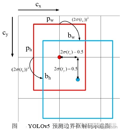 如下图 所示,蓝色框是标签边界框(ground truth box),bx、by、bw、bh分别为标签边界框中心点坐标和宽高尺寸,cx、cy是该标签边界框中心所占据网格(grid)与左上角的网格距离;红色的是先验框(anchor box),pw、ph是先验框的宽高。
