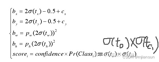 网络模型主要预测参数有边界框相关参数xt 、yt 、wt 、ht ,边界框置信度to 和第 i 类别的置信度tci。这些参数需要解码如下公式得到最终的预测框。