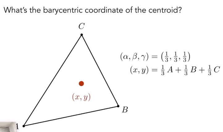 α = Aa的面积/三角形总面积。β = Ab/三角形总面积。同理γ。而由此定义我们可知三角形自己的的重心的重心坐标为(1/3,1/3,1/3):