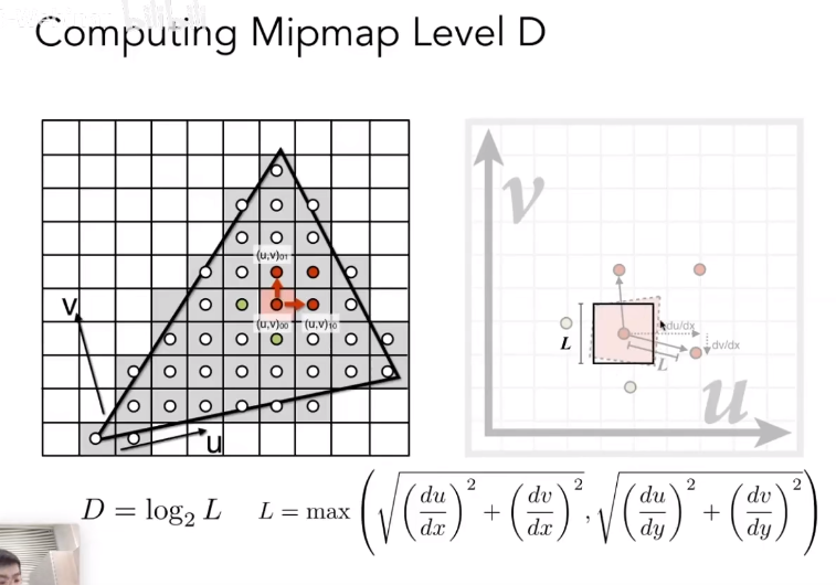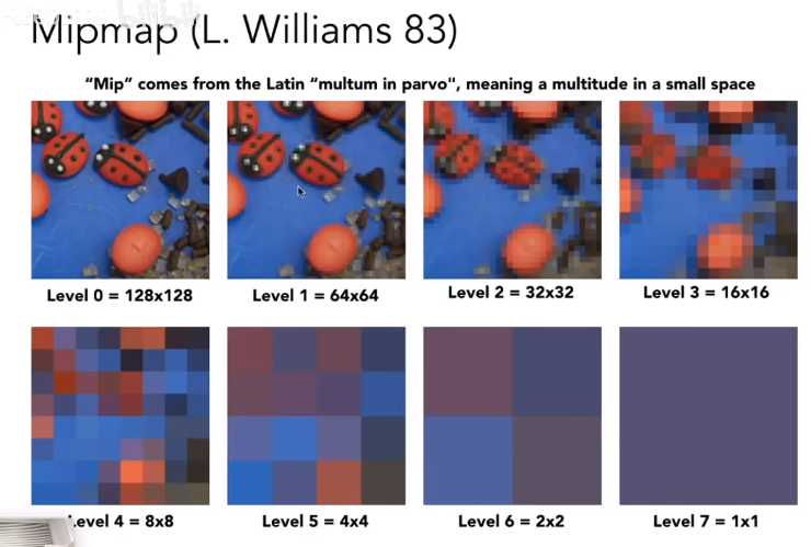 假设这个正方形区域边长为1,也就是一个像素,就可以知道这个区域在mipmap的第0层就是一个像素。假设边长为4,那么就可以知道这个区域在mipmap的第2层上是一个像素。这时候我们就可以根据对应的UV坐标去找到这个区域它的颜色。