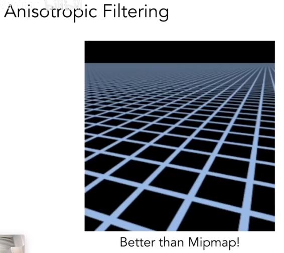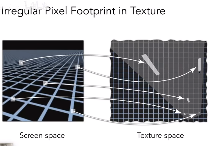 屏幕上的一个正方形映射到纹理中,其实不是一块正方形了,这时候若是按照mipmap的思路使用正方形去近似范围均值就会出现过分模糊的问题。而这时候我们使用了另一项技术:各项异性过滤,不再使用正方形,而是使用矩形区域去做近似,效果会好很多: