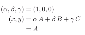 在三个点A、B、C的组成平面内的任意一点(x,y),都遵守上图中的式子。而如果想再满足找个点在ABC组成的三角形内,则需要它们都为非负数并且相加为1。也就是说,一个三角形内的点若满足上图两个式子,则它的重心坐标为: