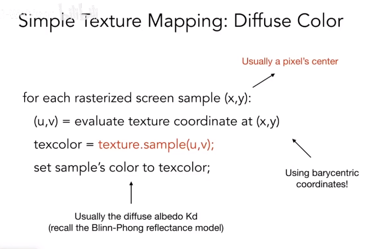 简单的纹理映射就是在屏幕上做采样的时候根据每个采样点的UV去取贴图上的一个颜色,采样点(顶点或者是经过类似MSAA后的采样点)之间利用重心坐标插值得到三角形内的每个点的UV,取贴图上的颜色,最终完成。