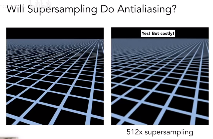 而现在发生的这种现象之前也见到过,也就是走样。走样的原因之前说过,是由于信号变化的过快而采样的速度跟不上,那对应在这个问题上就是一个像素所包含的纹理过大,这之中的变化过多。所以想要解决这个问题,我们可以用超采样: