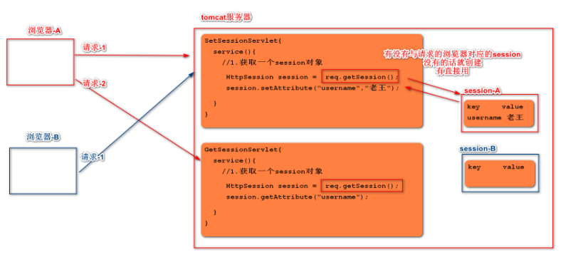 - 概念:服务器端会话技术,在一次会话的多次请求间共享数据,将数据保存在服务端的HttpSession 对象中.