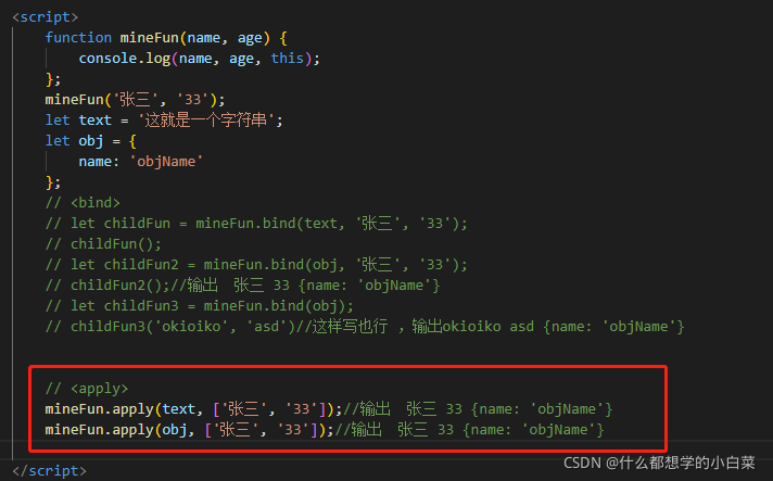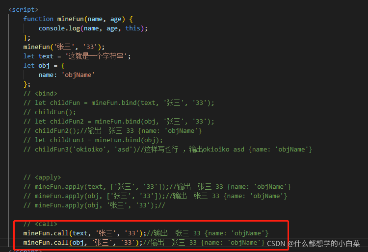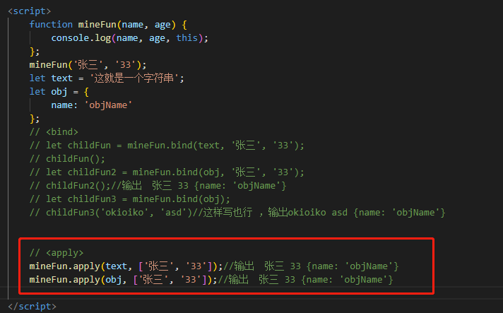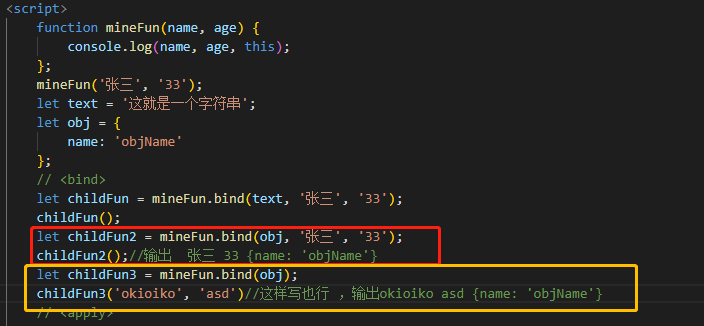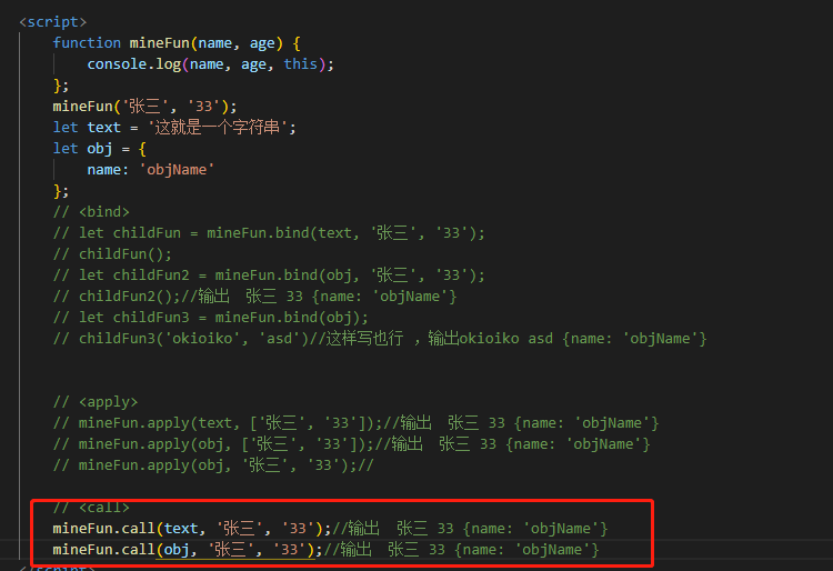 mineFun.bind(text, '张三', '33');// 输出如下: