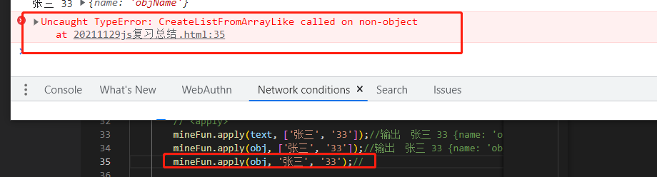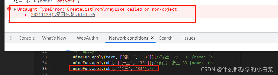 apply属性,也是改变this的指向,这一点与bind一致,区别就是,它不需要再次调用这个方法,其次它的参数必须是一个数组形式,否则就会报错: