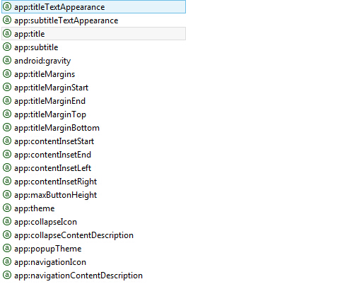 </android.support.v7.widget.Toolbar>我们把toolbar作为一个独立的布局xml,方便在其他布局里include进去。可以看到我们在这里是可以设置Toolbar的属性的,初上面的外还有以下的属性,都是见名知意的就不一一说明了。