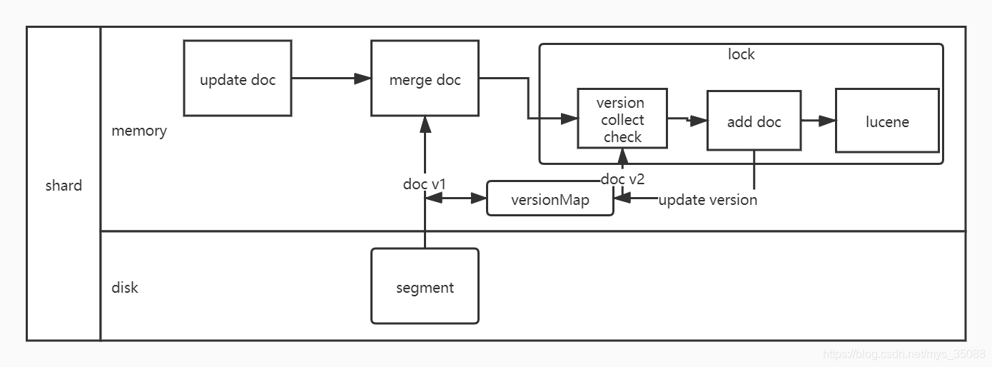 3.将版本v1的全量doc和请求中的部分字段doc合并为一个完整的doc,同时更新内存中的versionMap