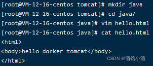 vim hello.html<html> <body>hello docker tomcat</body> </html>cat hello.html