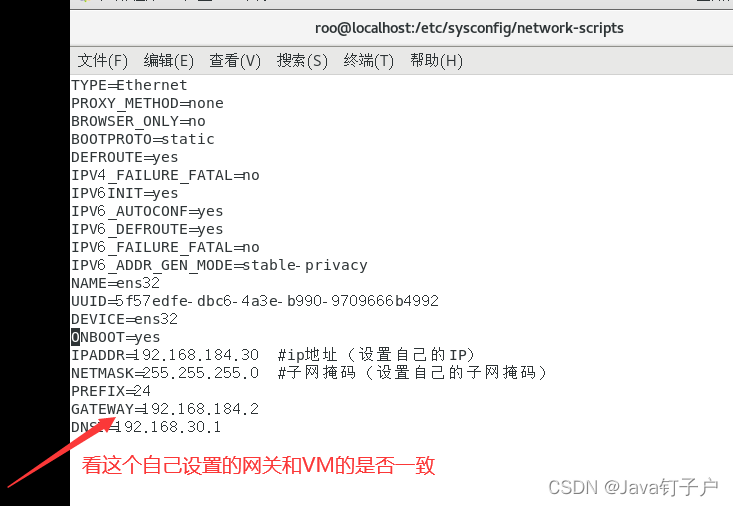 看自己的的VM虚拟机网关设置和 ifcfg-ens32 里面是否一致