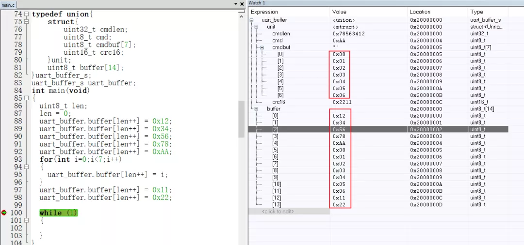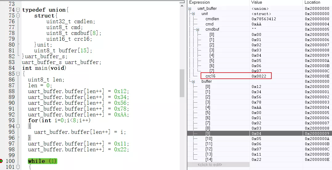 可以看到,我们只是往uart_buffer.buffer填充数据,模拟串口接收数据,接收完毕后,就自动解析出来我们自定义的cmdlen,cmd,cmdbuf和crc16。这里需要注意的是16位和32位的数据类型是小端模式,关于小端模式请看之前的文章《C语言在STM32中的内存分配》,这个还是很方便的。