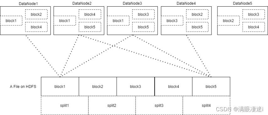 HDFS以固定大小的block为基本单位存储数据,而对于MapReduce而言,其处理单位是split。它的划分方法完全由用户自己决定。但需要注意的是,split的多少决定了MapTask的数目,因为每一个split只会交给一个MapTask处理。split与block的关系图如下: