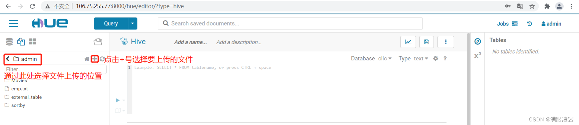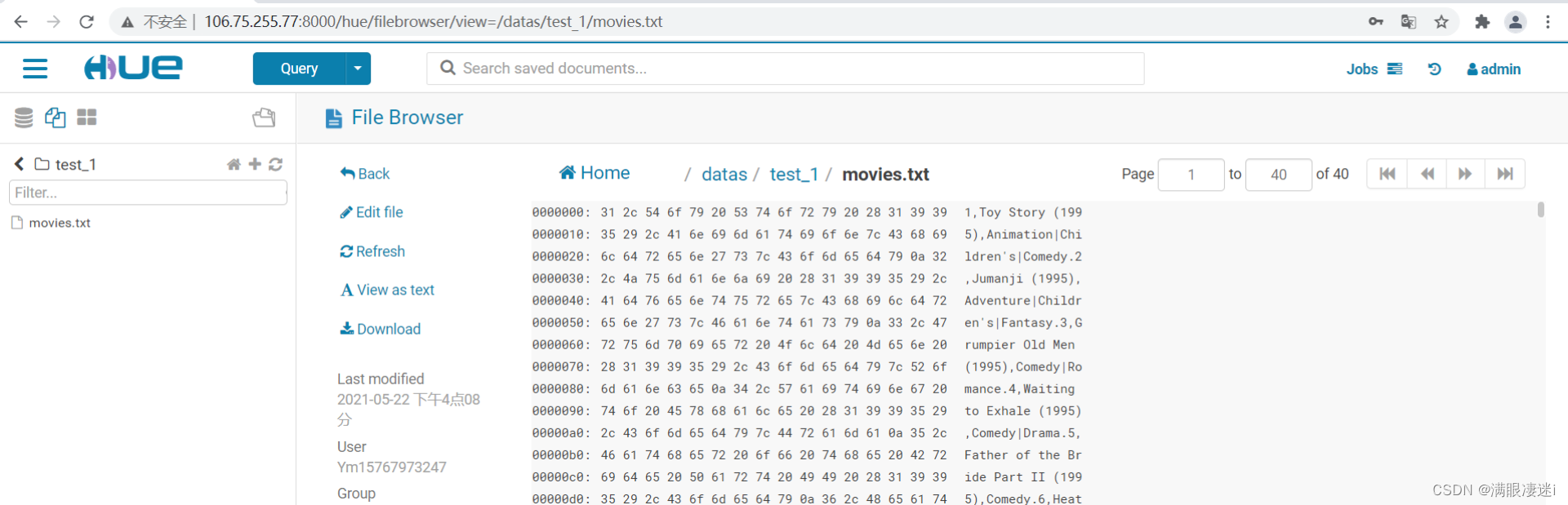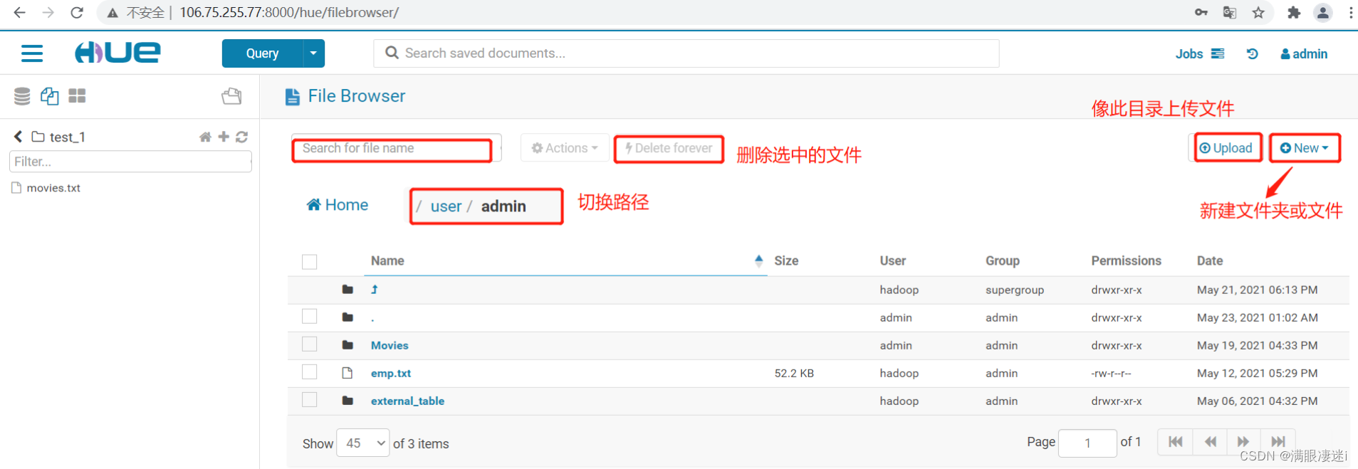 6.管理文件:点击Hue 图标标前的三图标选择 Files 进入文件管理界面