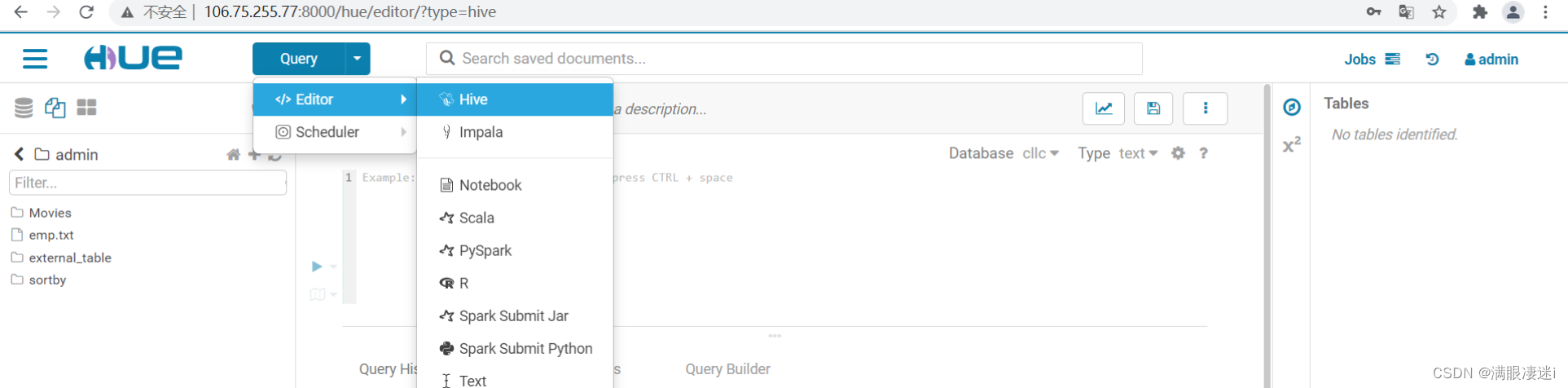 2.输入用户名密码进入Hue主界面,点击Query下拉按钮,选择Editor下的Hive选项,进入Hive;