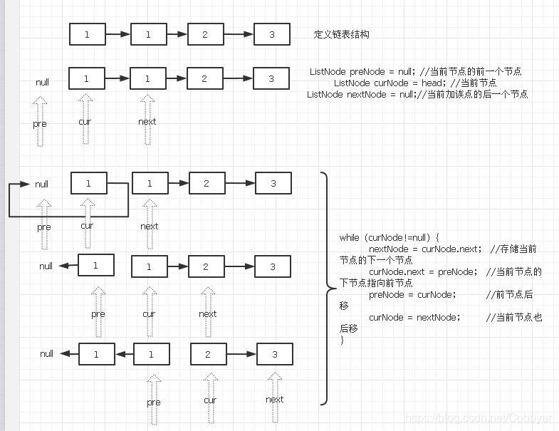 curNode.next = preNode; //当前节点的下节点指向前节点