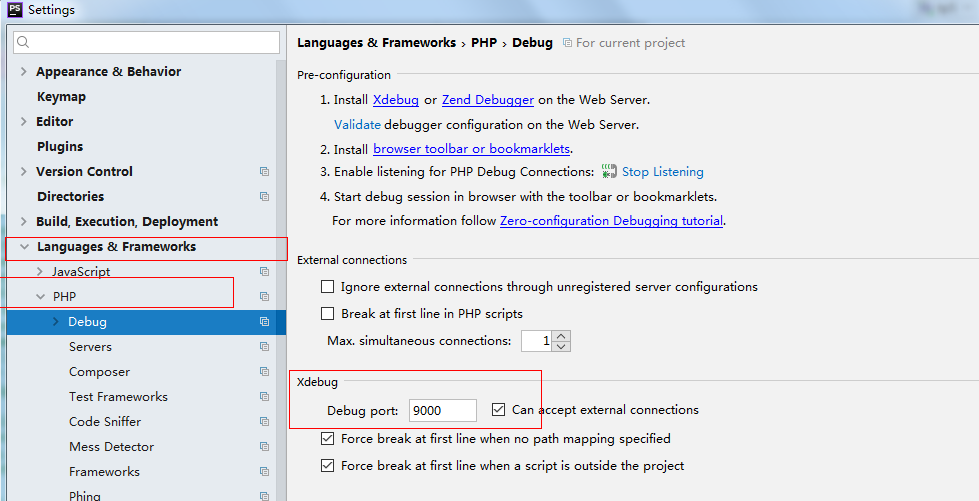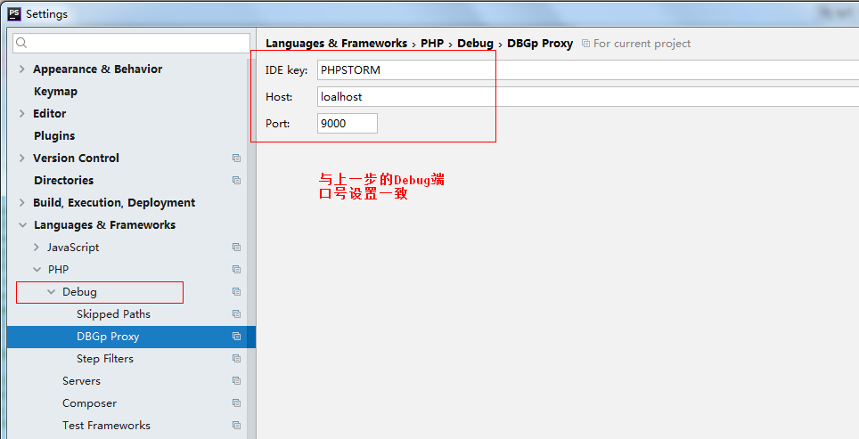 2、设置Debug端口号,“Debug port”与“xdebug.remote_port”一致。